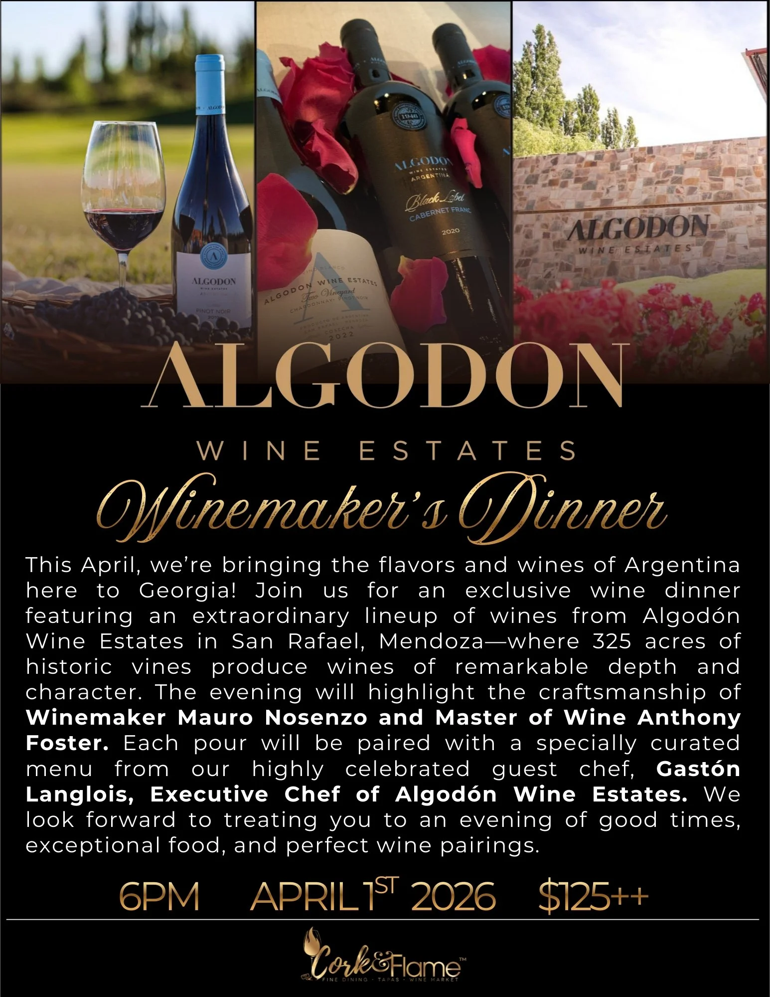 This April, we’re bringing the flavors and wines of Argentina here to Georgia! Join us for an exclusive wine dinner featuring an extraordinary lineup of wines from Algodón Wine Estates in San Rafael, Mendoza—where 325 acres of historic vines produce wines of remarkable depth and character. The evening will highlight the craftsmanship of Winemaker Mauro Nosenzo and Master of Wine Anthony Foster. Each pour will be paired with a specially curated menu from our highly celebrated guest chef, Gastón Langlois, Executive Chef of Algodón Wine Estates. We look forward to treating you to an evening of good times, exceptional food, and perfect wine pairings. Only at Cork and Flame.