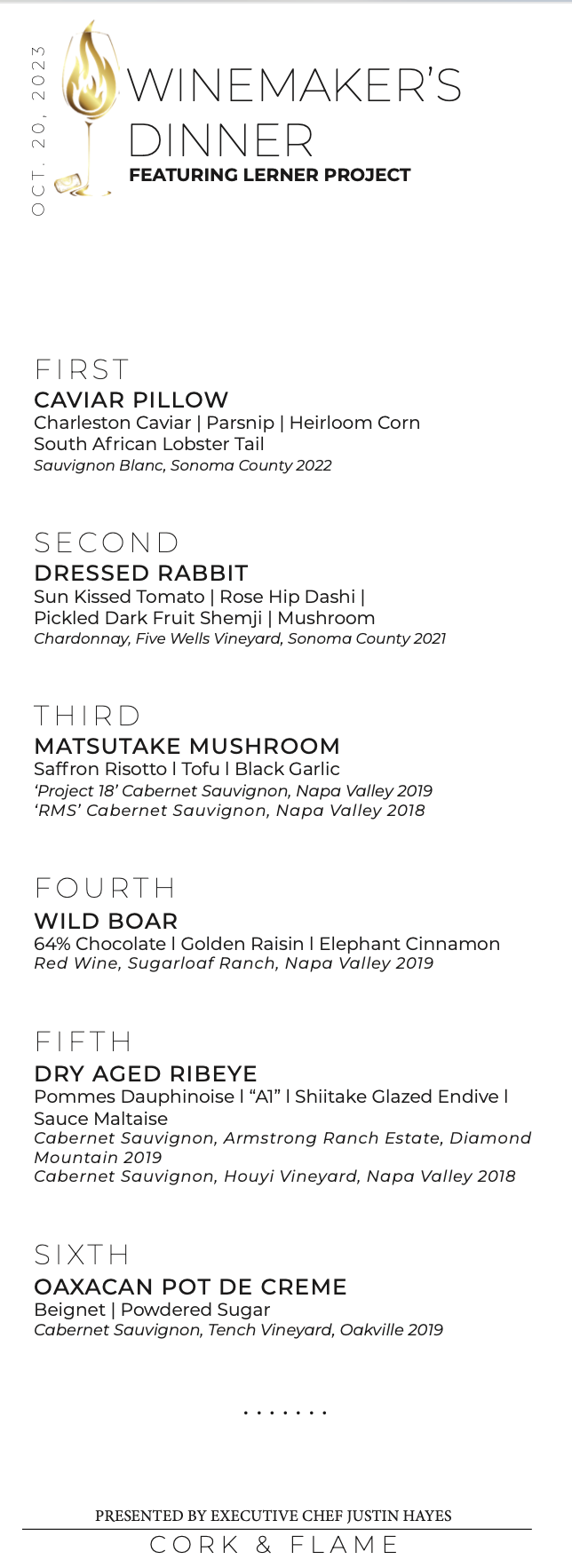 Join us along with our special guest, Stu Lerner, on Friday, October 20th as we experience boutique California wines from the Lerner Project paired with innovative dishes by Chef Justin Hayes.